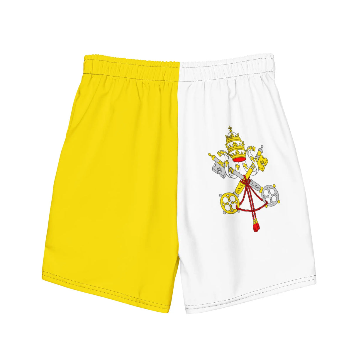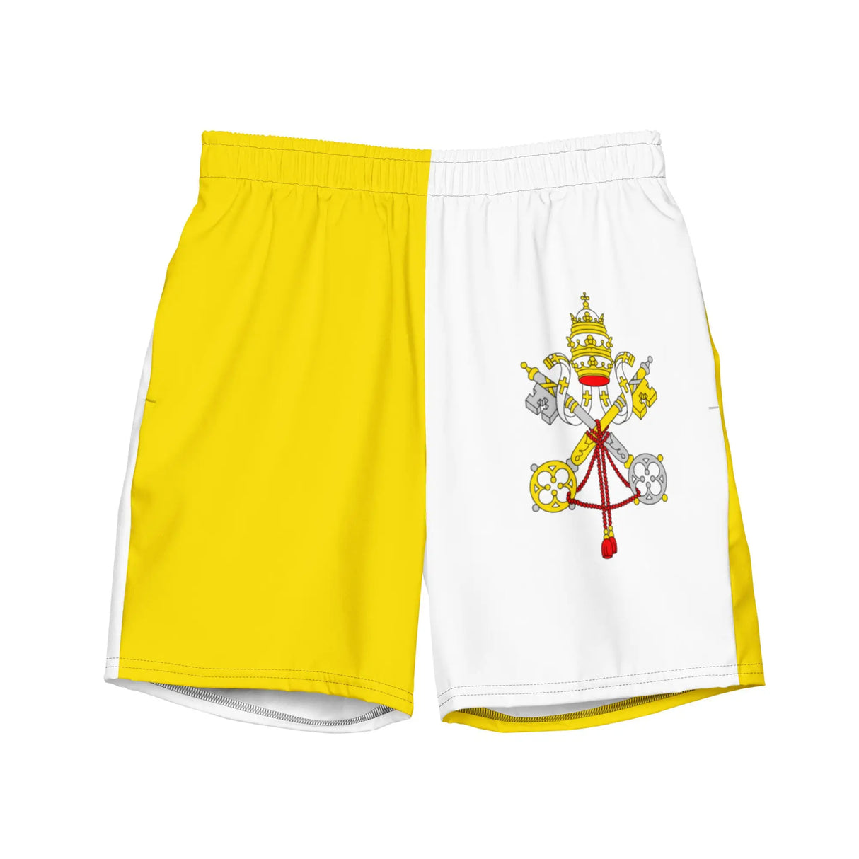 Nauti aurinkoisista päivistäsi näillä Vatikaanin lipun inspiroimilla uimashortseilla, jotka on suunniteltu mukavuutta, liikkuvuutta ja suojaa varten. Ihanteellinen rannalle, uima-altaalle tai vesiurheiluun.
